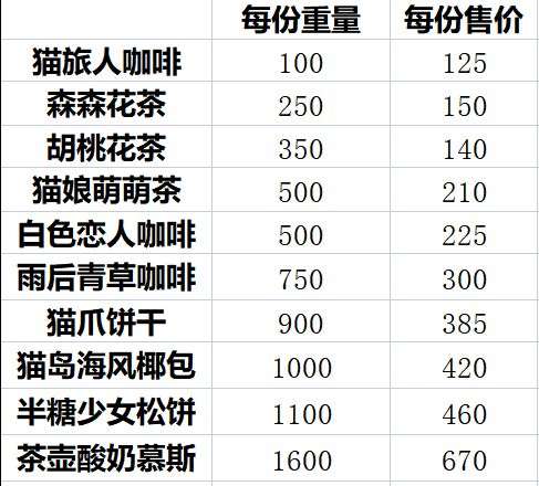 接下来依次是森森花茶>白色恋人咖啡>猫爪饼干。因为我买到猫爪饼干第22份的时候,负重就满了,所以我的实际采购数量就是第五列的数据。