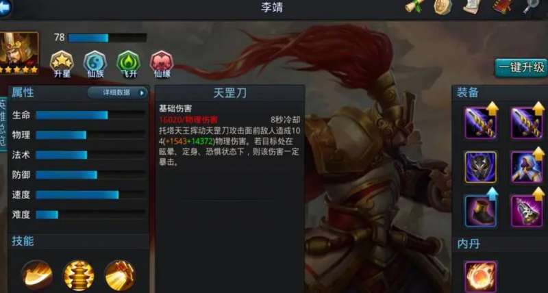 李靖的天罡刀在攻击目标的时候,会对其造成大规模爆发范围伤害。其玲珑塔技能持续时间为二十秒钟,一共能够释放出十次左右的攻击,但是无法暴击。照妖镜技能的持续时间为八秒钟,可减少敌方接近一半的移动速度,并降低百分之二十五的防御值。在技能结束的时候,李靖还能够眩晕敌方全体角色两秒钟,无视施法距离,是个非常强大的减益类控制技能。