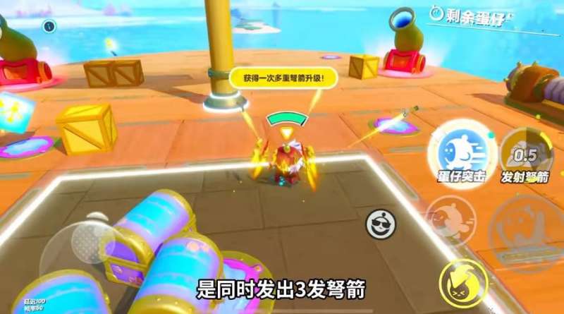 5、在你坐大炮在场上来回穿梭的时候要注意场上几个贝壳处。贝壳处会刷新箭谱升级道具,但每一次的弩箭升级只有单次效果,最开始刷新的蓝色简谱是双重弩箭。