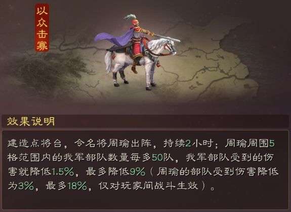 【以众击寡】为减伤类计策,这是在5大名将中,唯一一个纯减伤计策,不愧周瑜儒将之名。