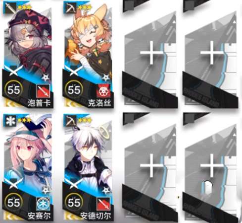 需求干员:泡普卡(群攻近卫)、克洛丝(单狙)、安德切尔(单狙)、安赛尔(单奶)
