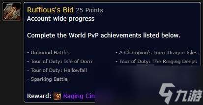 分别为完成8个pvp世界任务、完成8个PVP世界任务各五次(单独奖励一个小蜘蛛宠物)、战争模式下在多恩岛获取1000荣誉、战争模式下在鸣响深渊获取1000荣誉、战争模式下在圣陨峡获取1000荣誉、战争模式下在阿兹卡赫特获取1000荣誉、完成20次“战争火花”任务(单独奖励一个玩具,可以在敌人尸体上插旗)