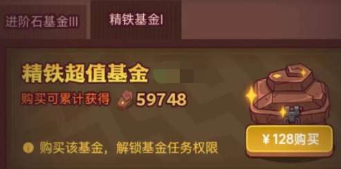 1、精铁基金不建议购买。这个礼包共分为四档,每一份精铁都需要128块,每2000关对应着一份精铁基金。精铁基金购买后,需要达标指定通关关卡数量才可领取。