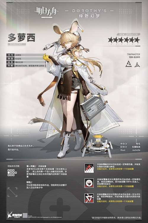 好啦~以上就是明日方舟六星特种新增干员多萝西的预告详情啦~更多关于游戏的情报与攻略还请期待更新哟~
