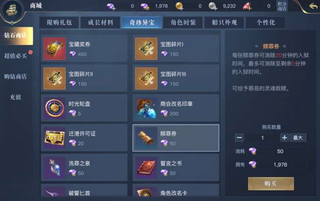我们可以通过缴纳赎罪券来减免监禁时间,赎罪券可以在钻石商店中花费50绑钻购买,每张赎罪券可以消除20分钟的入狱时间,最多可消除至剩余5分钟。