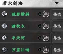若水剑法是江湖上常见的剑法,由许多江湖中人一招一式磨练而来,易上手,易贯通,广泛分布在江湖人士间,拥有2个招式,1个功体,1个秘技。