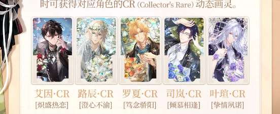 活动奖励:花朵【盛放】时即可获得对应角色动态收藏画灵:艾因CR【炽盛热恋】、路辰CR【澄心不渝】、罗夏CR【笃念骄阳】、司岚CR【倾慕相逢】、叶瑄CR【挚情夙诺】。