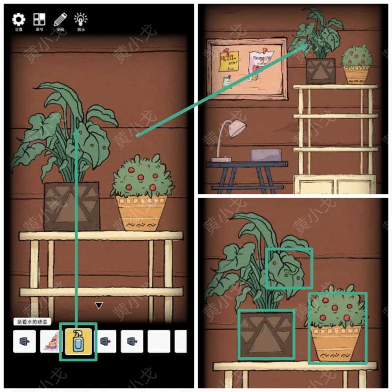 24.点击架子上的盆栽,用【装着水的喷壶】喷盆栽,获得【青虫】(注意看上面的图案及个数:红色圆点-8、三角形-7、正方形-7、不规则-3)