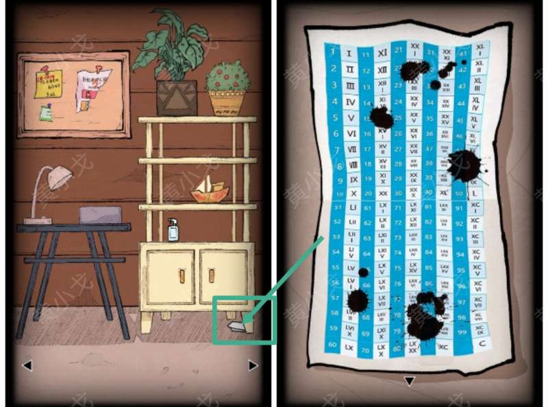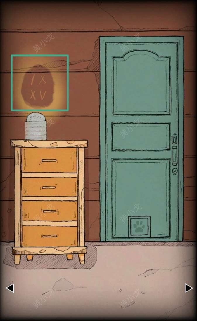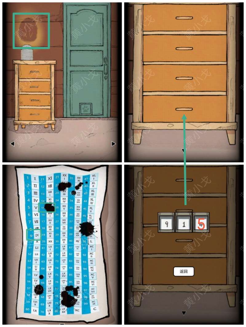 19.点击柜子的第四个抽屉,根据墙壁上的线索:IX XV,找到柜子下纸条上对应的罗马数字和阿拉伯数字,输入密码:915