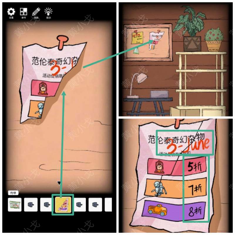 28.(桌子)点击黑板上的传单,放入【传单】,获得线索(3-June-六月、立钟五折-粉色、机器人七折-橙色、车八折-紫色)