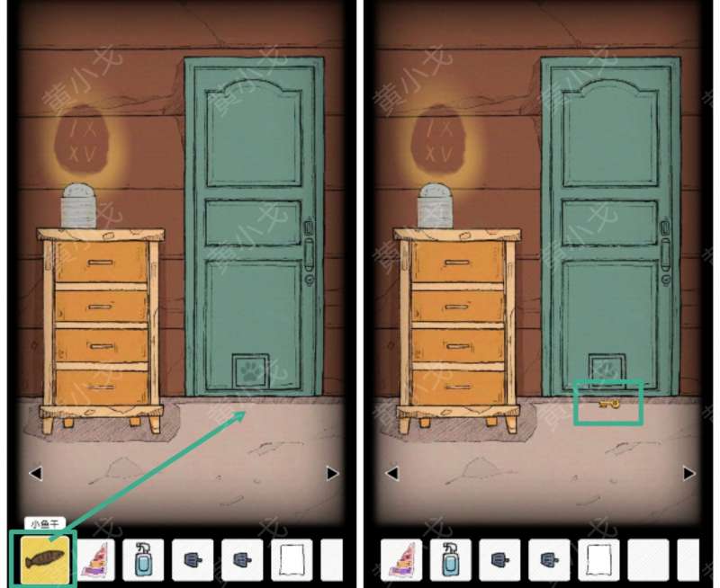 21.把【小鱼干】放到门上有猫爪图案的格子下方,获得【钥匙B】
