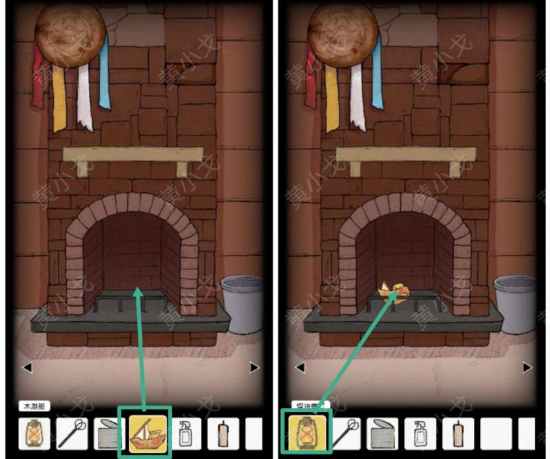 6.把【木雕船】扔进壁炉,用【煤油提灯】点燃