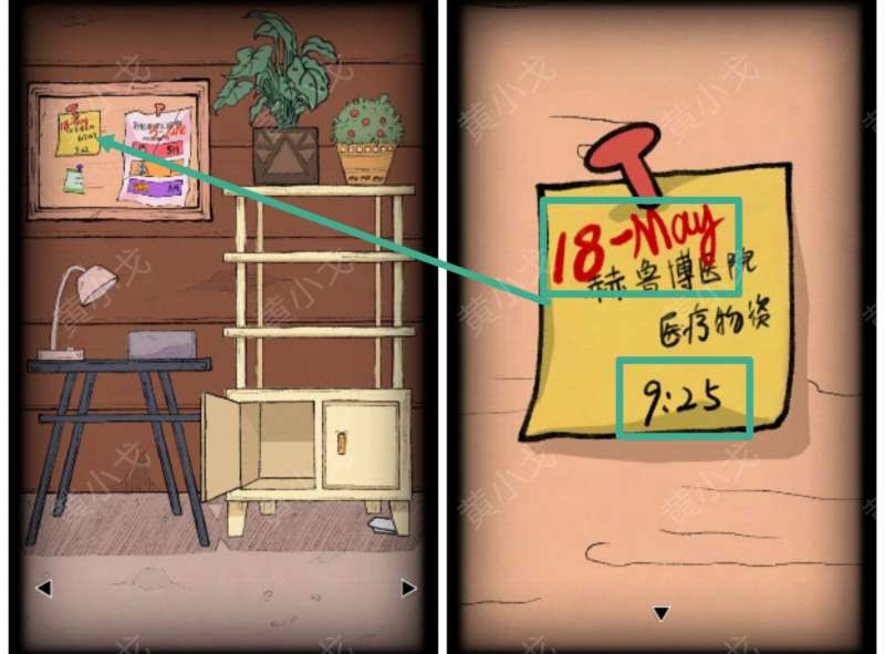 29.查看黑板上的黄色便签,获得线索(18-May-五月、时间:9:25-黄色)