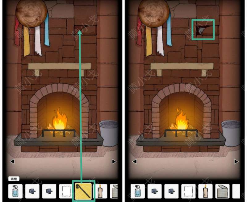 7.用壁炉里的火点燃【蜡烛】,获得【点燃的蜡烛】。用【火钳】夹得【钥匙A】