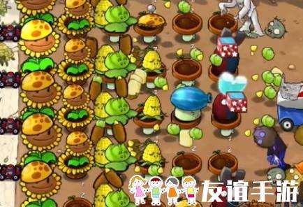 3、在中间一列补充玉米卷香蒲,在最右侧提前种植几个阳光土豆雷。
