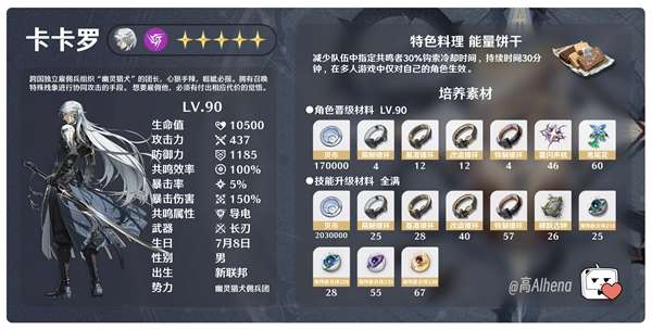 LV.90:生命值10500,攻击力437,防御力1185,特色料理是咩能量饼干,可提为指定角色供持续30分钟的30%钩索冷却时间,在多人游戏中仅对自己的角色生效。