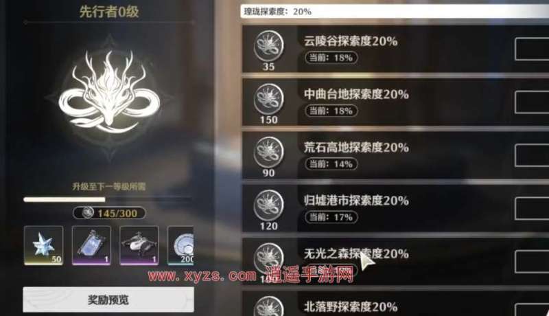 2、在这里可以查看各个地区的探索度情况,当探索度达到一定要求之后可以提升先行者等级,并且解锁对应的奖励。