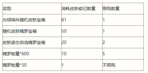 2)每消耗10点券可以购买1个皮肤徽记并获赠1个光明哨兵超值皮肤宝箱。