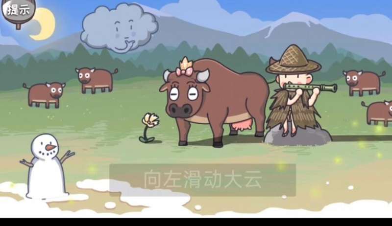 6、按住牛头向右滑动,等牛流鼻涕的时候,点一下鼻涕泡,就能找到【木牛流马】了