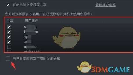 4、此时列表会出现在此电脑登录过得账号,然后勾选就好了,当你的好兄弟玩共享游戏时,你上号就会把他踢下线,因此勾选“当已共享库再次可用时显示通知”即可。