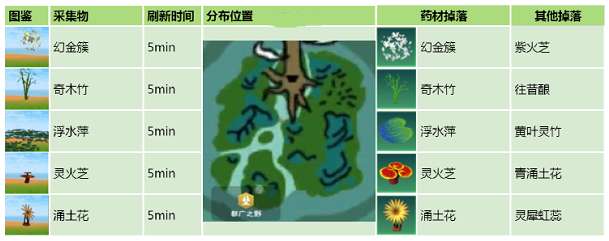 1、绿色品质药材说明:新岛的采集物可以获得,刷新快,都广之野普遍分布着。