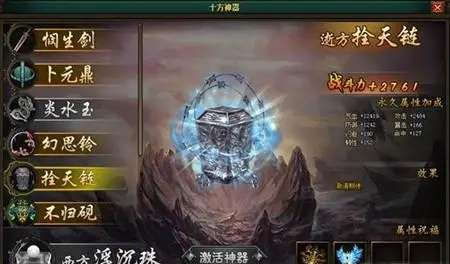 卜元鼎可以提升减伤属性,同时还能回复己方单位的生命力,是辅助向的群体增益神器。谪仙伞可以反弹敌方的攻击伤害,就算反弹失败所受到的伤害也会降低百分之三十,是目前来说性比价和作用最高的神器。玄镇尺是提升仙术2伤害的,主动释放技能可以对敌方造成群体伤害,不过伤害倍率比较低,只适合用来打副本中的小怪。炎水玉也是治疗的神器,能够在短时间回复大量的生命值。悯生剑是增强全体攻击力的神器,在群体战斗中比较适用。拴天链的主打效果是封印,能够限制敌人的攻击和动作。不归砚则是提高全体的生命值上限,同时还能增幅仙术3。