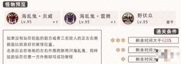 经典的小怪层,如果没有聚怪角色则需要多熟悉站位聚怪,上半间练度低的话生存压力会比较大,同时记得上半间绝对不能纯带冰系输出,下半间不要带纯雷队伍(有场地石)