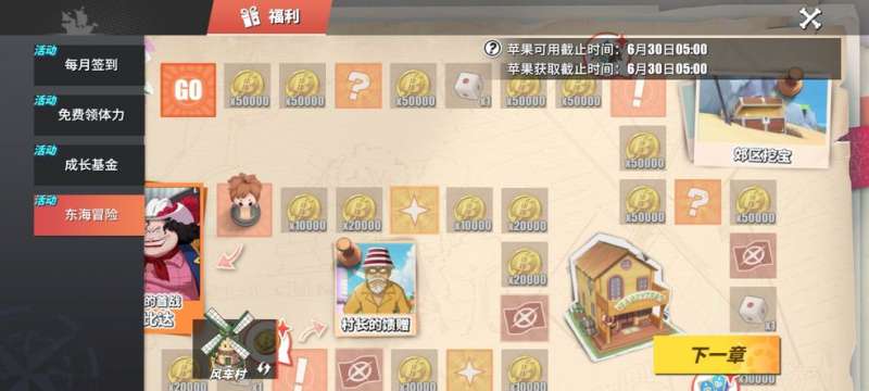 东海冒险通关后各个格子奖励是固定的,所以可以有目的性的掷骰子,来节省苹果,更多的进入到金果、高招碎片的格子。