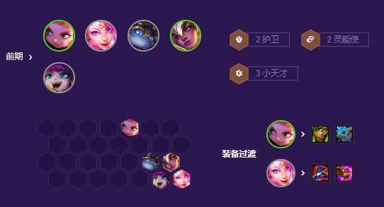 前期靠天湖法系过渡,小天才前期很不错,然后补两护卫两灵能使。中期换佐伊打工就好。