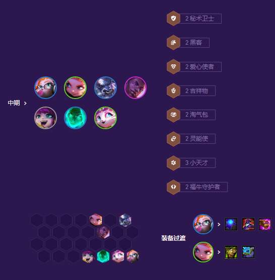 前期尽量用强势棋子与羁绊打工,保证打工棋子2星,进而稳定血量健康,步入7与8阶段,7与8阶段低费打工卡向以4-5费棋子为核心阵容转型。