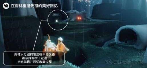 完成方法:前往雨林水母图前左边树干分叉路,继续走向被砍掉的树干左边,点燃先祖并回忆收集过程。