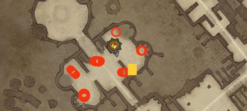 下图中人物所在位置为遗书位置,书本3分钟一刷,红色标点位置为6波怪,黄色标点位置为地图流沙秘境入口之一。