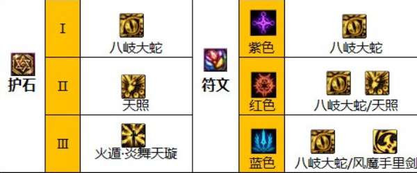 2、符文推荐:紫色八岐大蛇*3,红色八岐大蛇*2,天照*1,蓝色八岐大蛇*1,风魔手里剑*2