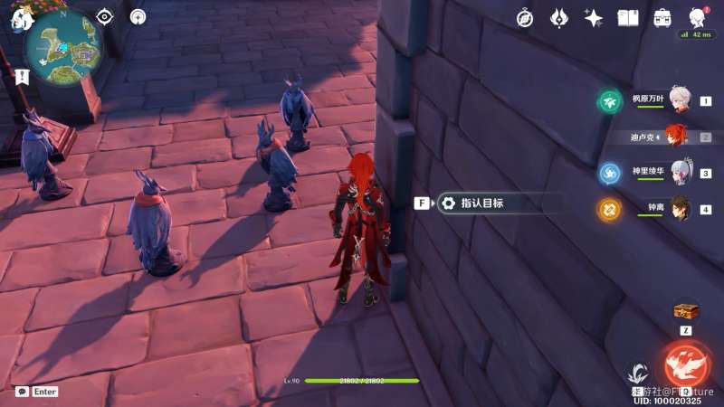 注意,这里由于雕像们站的很近,直接过去选无法分辨出哪个选项对应哪个角色,很容易选错,建议来我下图的位置,贴着墙一点点挪到只能选到“盗宝团「呱」”的位置再进行指认。