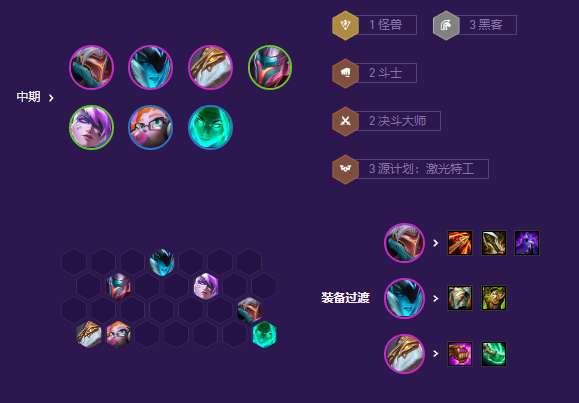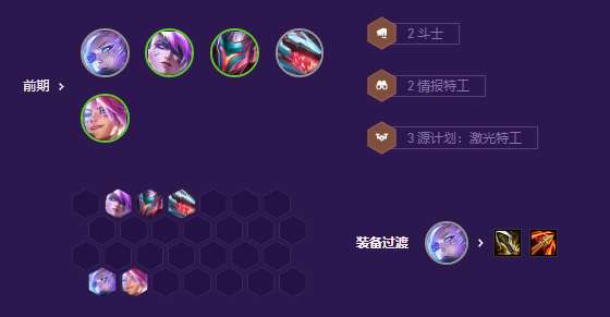 前期用3源计划2情报寒冰过渡,带劫的装备打工。5人口补亚索开3源计划,或者补琴女开3地下魔盗团贪霞奖励。可以用这套阵容一直过渡到7人口。