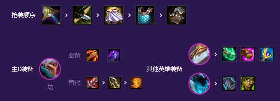 开局优先拿大剑次选攻速。前期可以合无尽过渡,第二件补夜刃。最后一个补飓风打输出。龙王为阵容副C佩戴青龙刀法爆大天使。猪妹可以带个鬼书打减疗。