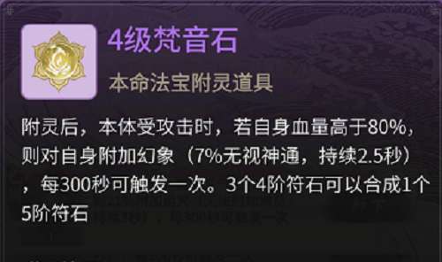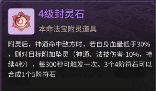 效果为自身收到攻击则获得增益(抵挡目标神通、法技伤害),和封灵石一样,每次对战都能触发,虽然效果和封灵石一样,但是一个负面状态一个是增益!目前大多数神通效果多少带点净化(驱散减益)效果,而带驱散(移除增益)的缺很少!