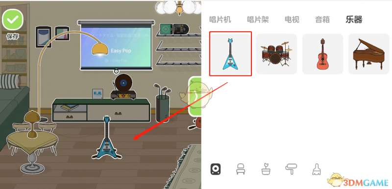 3、点击乐器,选择想演奏的乐器,拖动到音乐空间里。