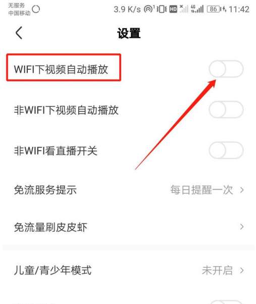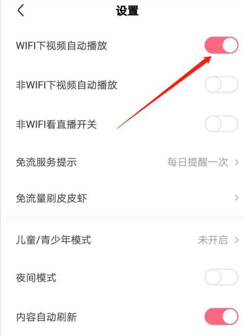 5、“设置”页面根据指引点击“wifi下视频自动播放”开关标识。如图所示: