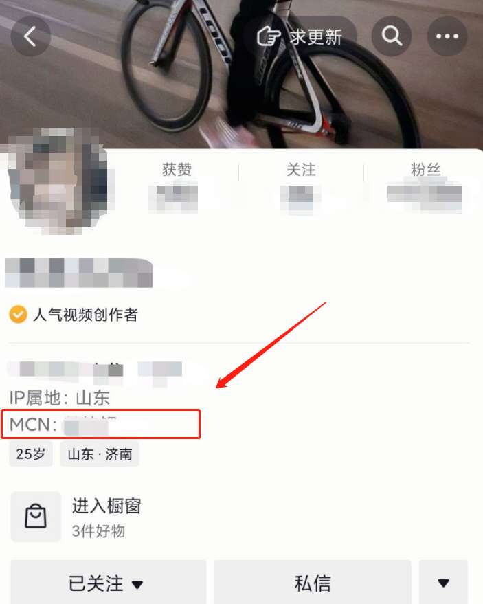 3、然后,在主页ip属地的下方就可以看到该账号所属的mcn公司了。