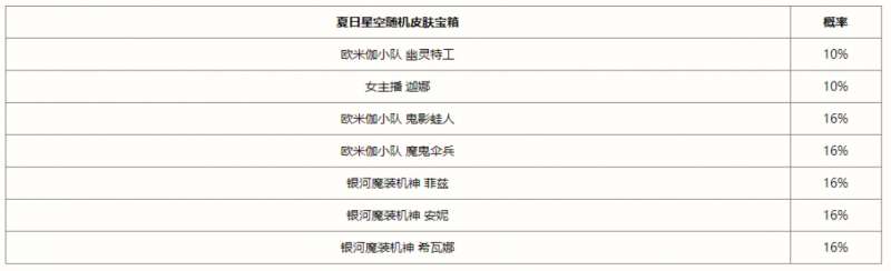 2)夏日星空限时魄罗宝箱,打开20次至少掉落2个夏日星空随机皮肤宝箱。夏日星空随机皮肤宝箱概率始终为15%。