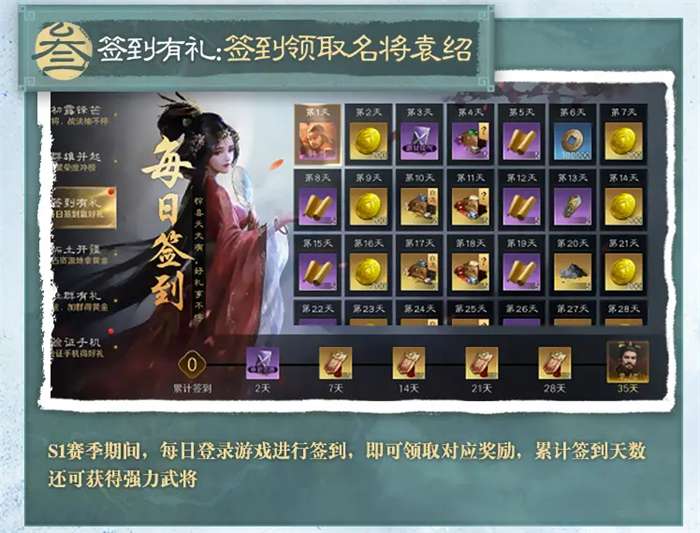活动介绍:在公测S1赛季期间,玩家每日登录游戏进行签到,即可领取对应奖励,累计签到天数可获得【橙色武将袁绍】、【求贤令】、【黄金】及海量养成材料。