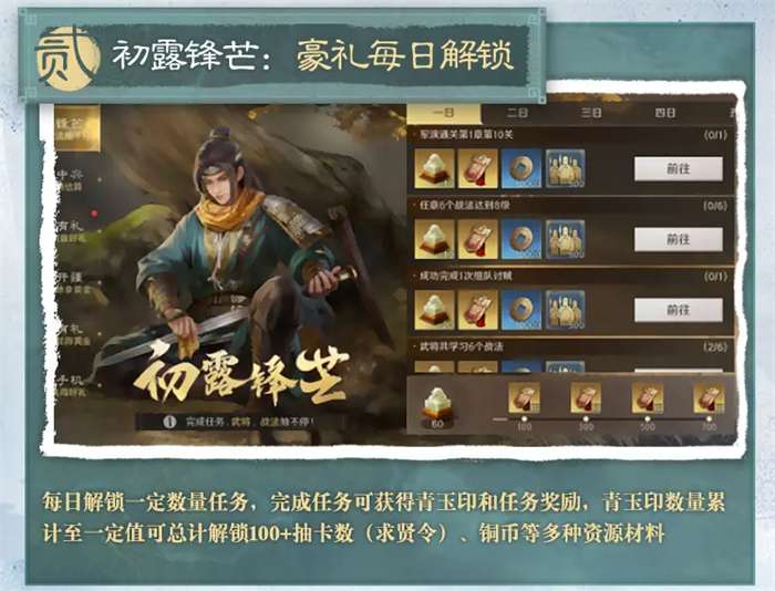 活动介绍:自开服后每日解锁一定数量任务,玩家完成任务可获得青玉印和任务奖励,青玉印数量累计至一定值可总计解锁超过100抽(求贤令)、铜币等丰厚奖励!