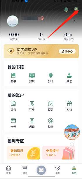 1、点击藏书馆中的我的个人中心,选择的上方的设置。