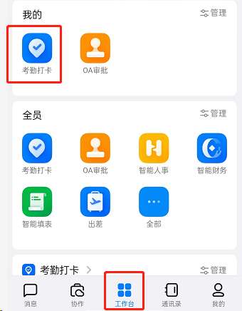 1、打开钉钉,点击工作台,点击考勤打卡。