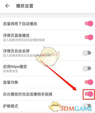 3、找到后台播放时自动连播相关视频,关闭右侧开关即可。