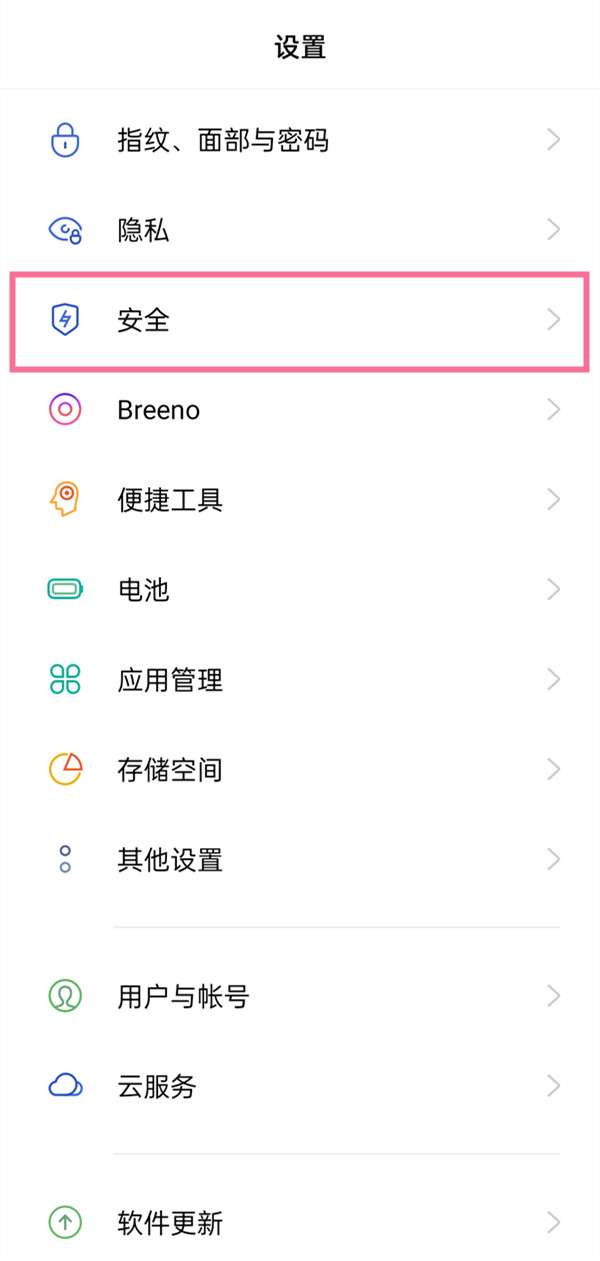 1、打开设置,找到安全并点击进入。