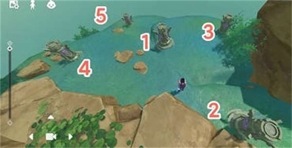 1、我们的左边的选择稻妻是不变的,右侧选择蒙德还有璃月,不选择稻妻,然后先去左侧的稻妻山看雷灵的顺序,右侧是什么山就是什么位置,来到稻妻山顶传送点,往左边下去找到雷灵和雷方碑,解密的顺序如图所示;