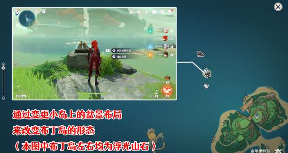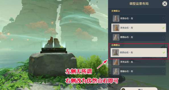 8、对话后了解到它们想去蒙德玩,将左右的盆景都换成[优悠山石]。