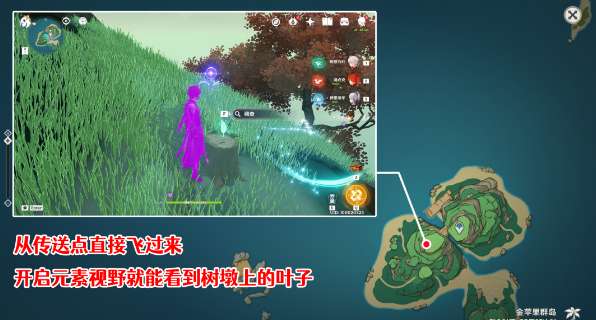 4、直接回到传动点飞过来也行,这样反而快一点,能够看到山顶的树墩,能够得到一片叶子。